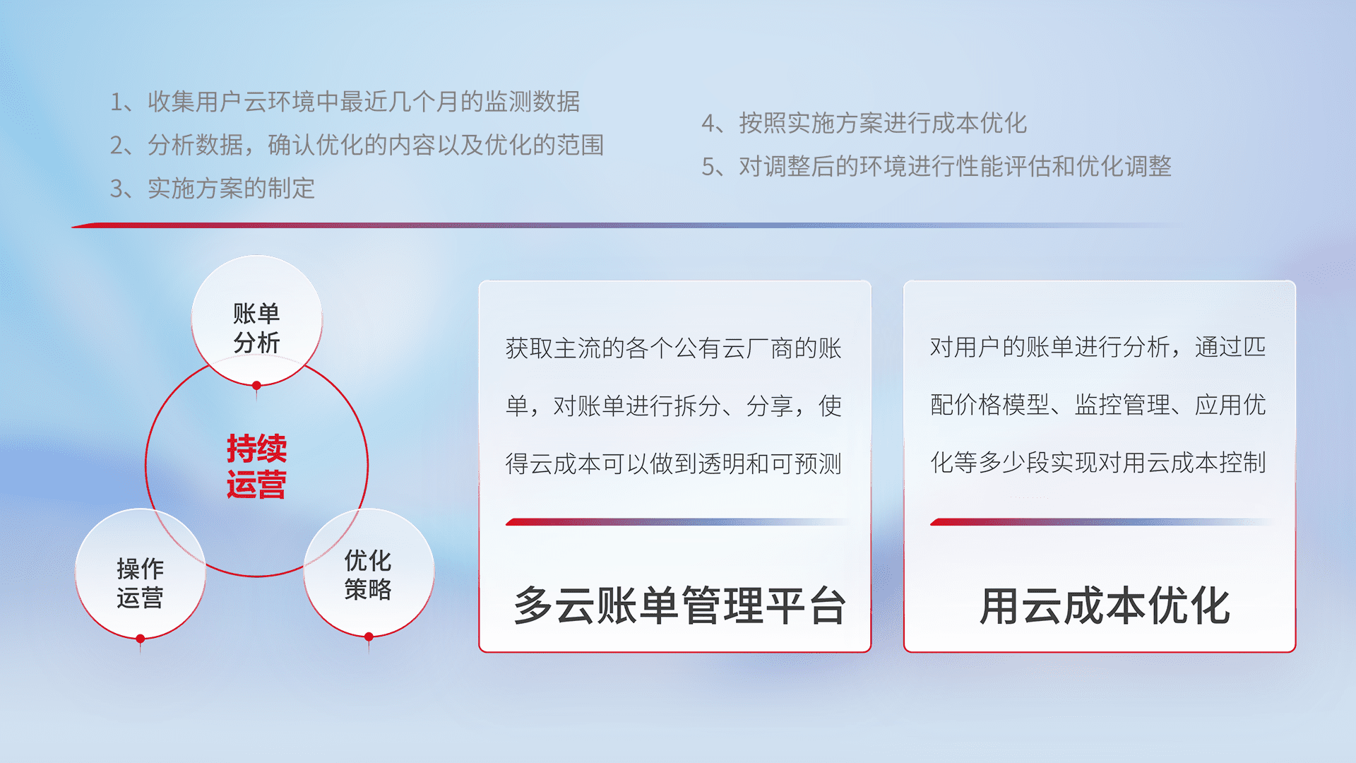 通过多云纳管,,,以统一的资源数据模型把客户的云资源进行抽象和封装,,进而实现对多云资源的统一操作,,,,保障云资源管理的可靠性、、、稳定性与可用性。。。。量身定制化运维内容,,配置、、、开发运维、、、、补丁管理、、备份、、、监控、、、、认证和访问管理、、、审计和日常巡检等,,,保障在用云过程中的可靠度,,,稳定度以及高可用率。。