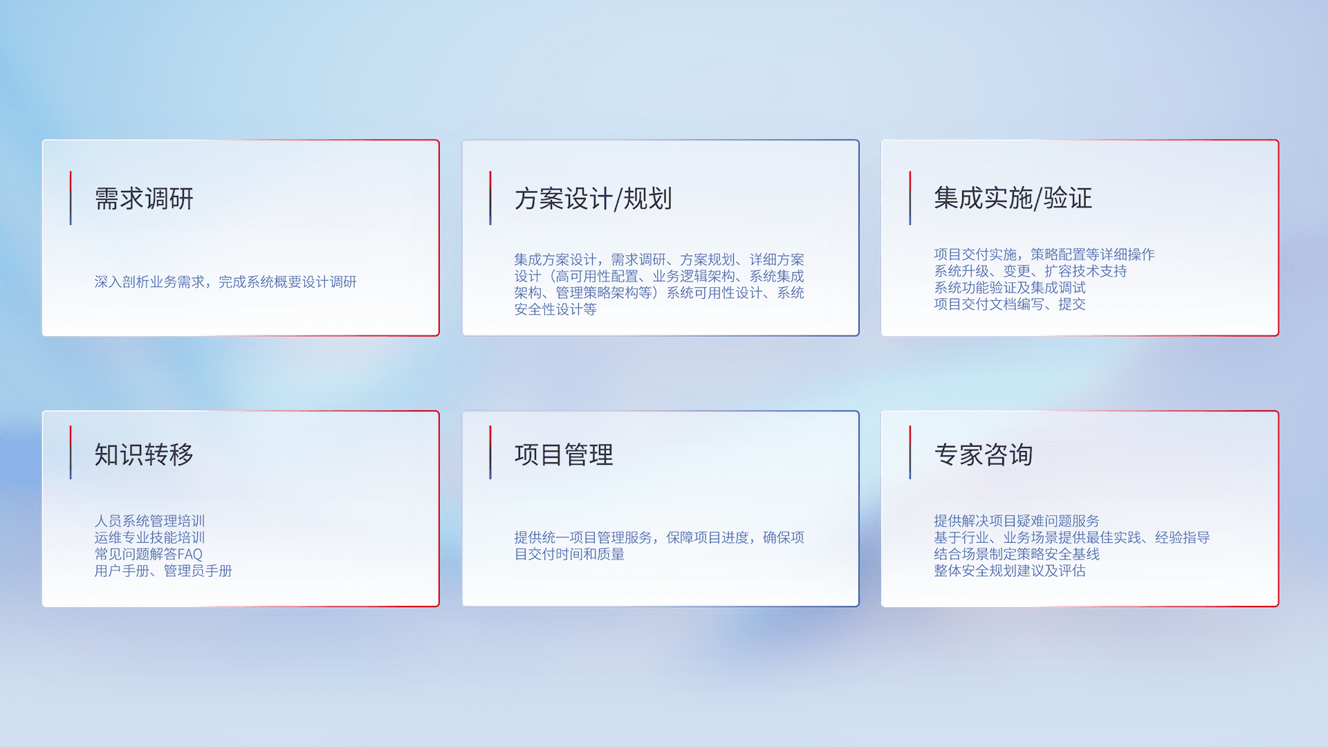 针对客户行业特性,,,将宏观的安全战略和需求,,通过专业的交付服务,,,实现项目落地,,,为客户提供标准规范的集成交付服务。。。